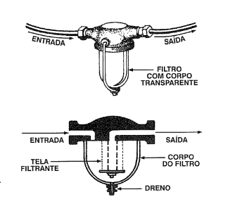 Elementos que retêm partículas e impurezas do combustível. Podem ser de tela, papel ou fibra e, em alguns casos, têm corpo transparente para inspeção visual.