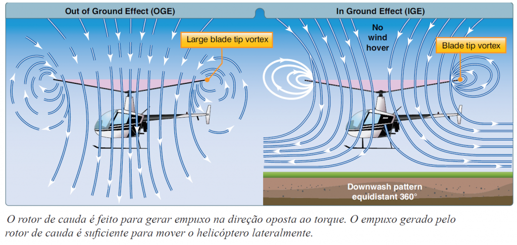 Ao pairar próximo ao solo ocorre um fenômeno conhecido como efeito de solo. Este efeito normalmente ocorre em alturas entre a superfície e um rotor de diâmetro acima. The friction of the ground causes the downwash from the rotor to move outwards from the helicopter.