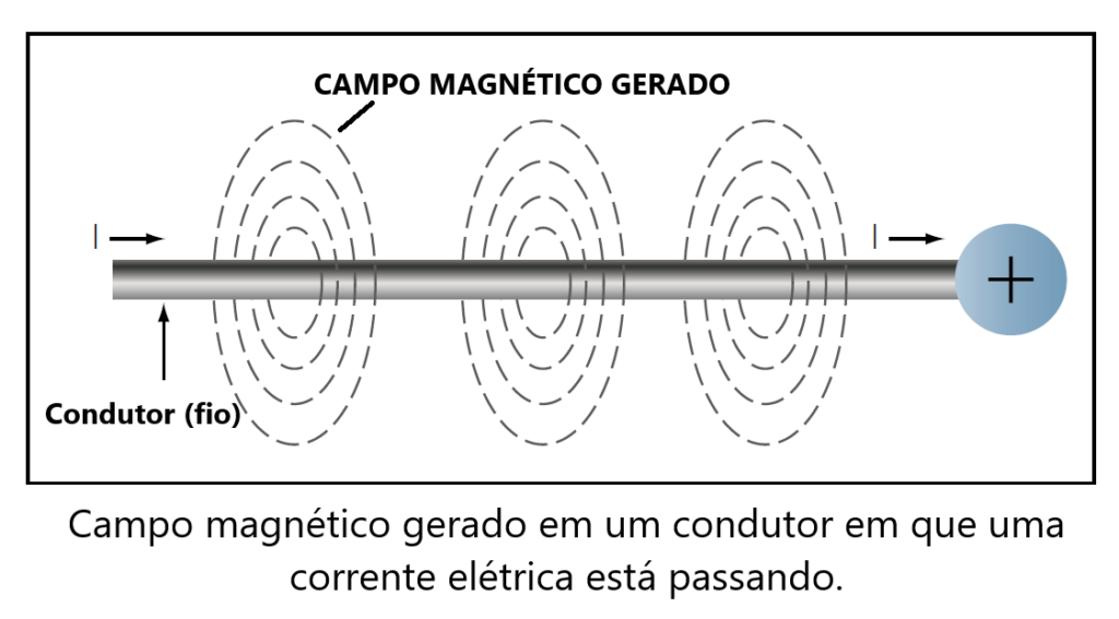 Simultaneamente, a corrente elétrica em movimento também gera um campo magnético. O campo magnético é criado ao redor do condutor e sua direção pode ser determinada pela regra da mão direita: se você posicionar o polegar na direção da corrente, os dedos da mão direita indicarão a direção das linhas de campo magnético. A intensidade do campo magnético é medida em teslas (T).