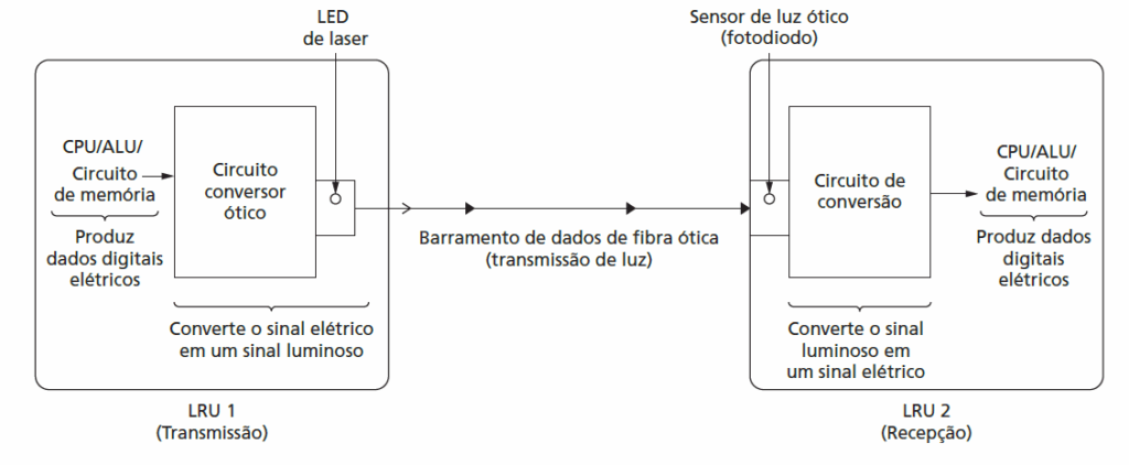 • Transmissor Óptico: Componente que converte pulsos de corrente elétrica em pulsos de luz infravermelha, usando um LED ou laser semicondutor, e os acopla à fibra óptica.