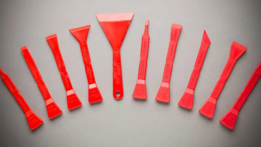 - Ferramentas de carenagem: Espátulas projetadas para moldar e injetar selante em áreas onde os bicos injetores não alcançam. São utilizadas também para dar acabamento ao selante ainda não curado e remover bolhas de ar.