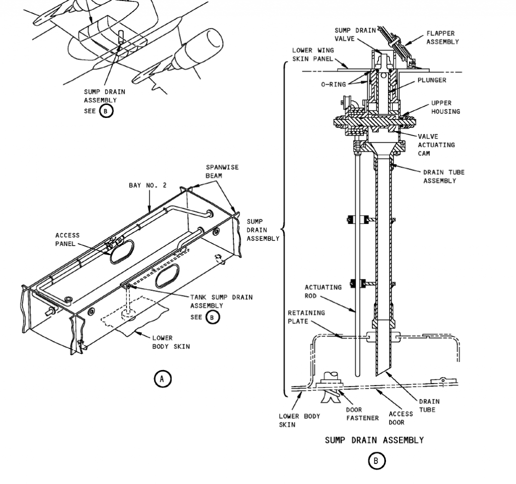 R: A água/umidade se acumula no ponto mais baixo. As válvulas de dreno dos tanques (asa, central e ventilação) são usadas para remover essa água durante inspeções e procedimentos de manutenção.