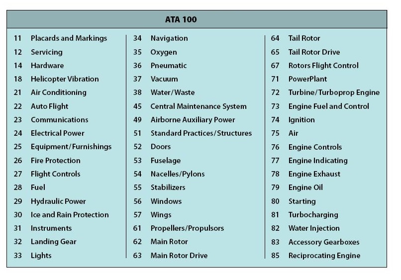 Os manuais técnicos utilizados na manutenção de aeronaves são editados ou criados de acordo com especificações de padronização criada pela ATA – AIR TRANSPORT ASSOCIATION of AMERICA para os dados ou informações técnicas dos fabricantes e por isso que chamamos de ATA 100.