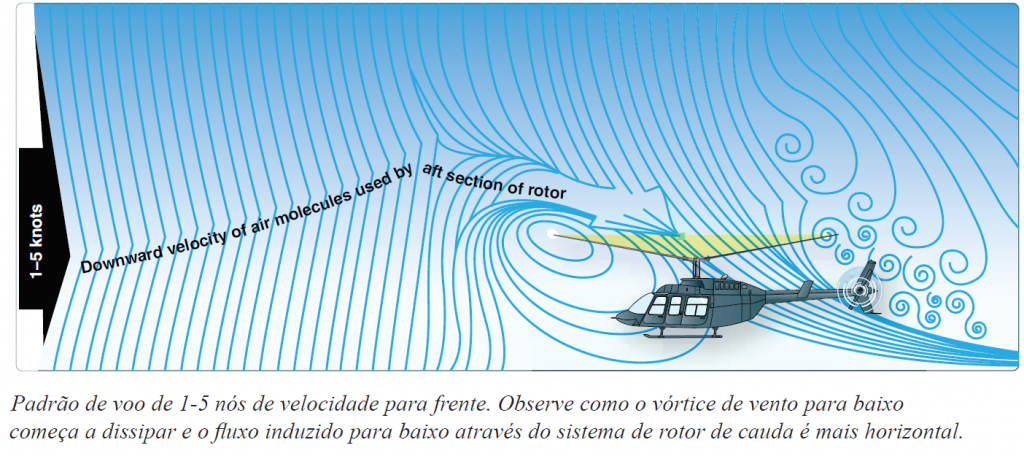 R: Entre cerca de 16 e 24 nós, o rotor passa a trabalhar em ar mais limpo, diminuindo vórtices/arrasto induzido. Com mais eficiência, exige menos potência para sustentar, facilitando a transição do pairado para o voo para frente.