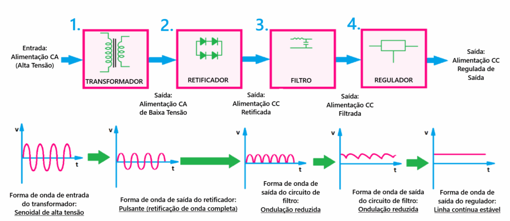 O processo para alcançar essa estabilidade pode ser dividido em quatro etapas principais, que formam o diagrama de blocos básico de qualquer fonte de força.