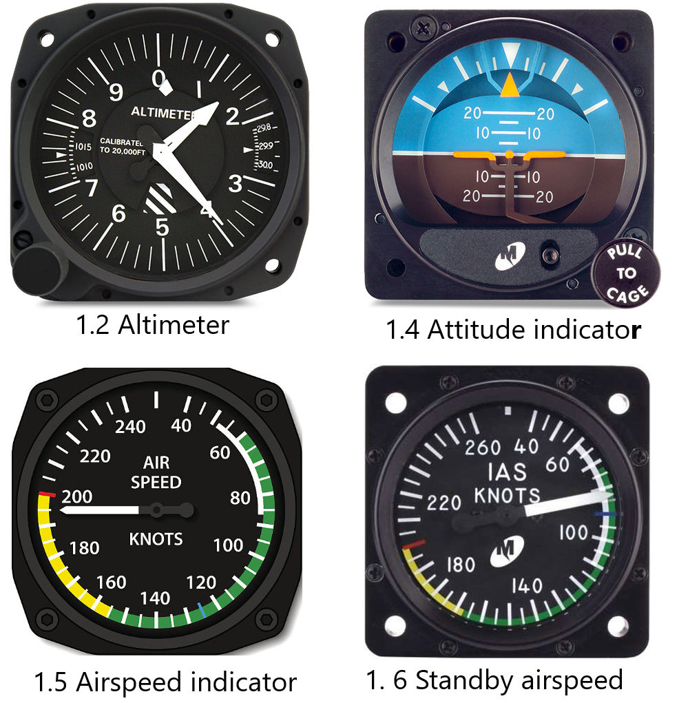 | Altímetro (Figura 1.2) | Indica a altura da aeronave (em pés ou metros) acima de um nível de referência (geralmente o nível médio do mar) medindo a pressão do ar local. Para fornecer leituras precisas, o instrumento é ajustável para a pressão barométrica local. Em aeronaves grandes, um segundo altímetro de reserva está frequentemente disponível (ver Figura 1.3). |