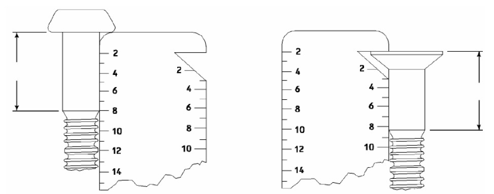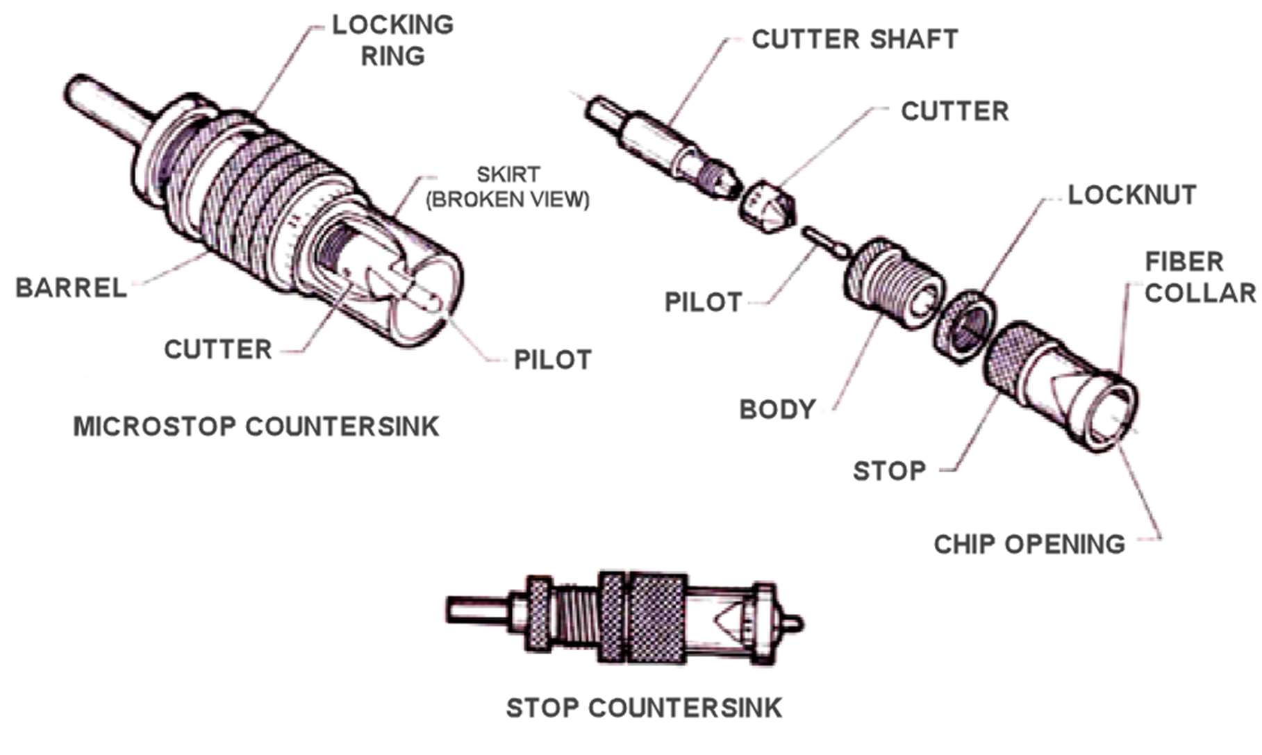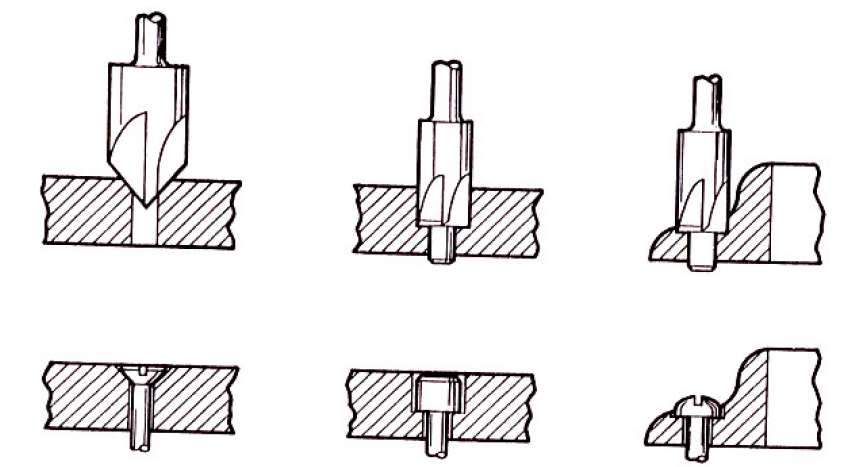 Cortador usado para criar alojamento cônico no furo, permitindo instalar fixadores de cabeça escareada nivelados com a superfície.