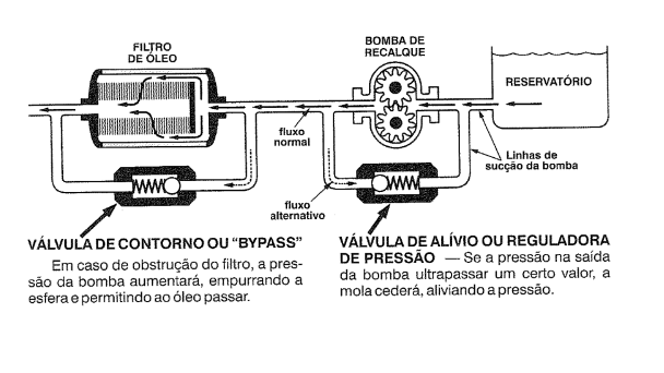 c) Válvula de Contorno ou “Bypass”: Esta válvula entra em ação quando um dispositivo, como o filtro de óleo, fica obstruído. Ela permite que o óleo contorne o dispositivo entupido, evitando o bloqueio total do sistema de lubrificação. Se o filtro estiver obstruído, a pressão aumentada da bomba empurra a esfera da válvula de contorno, permitindo que o óleo continue a circular, assegurando a continuidade da lubrificação.