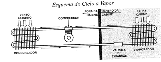 Sistema de refrigeração semelhante ao de geladeiras, que usa um fluido refrigerante (como R-134a) em mudanças de fase para remover calor da cabine.
