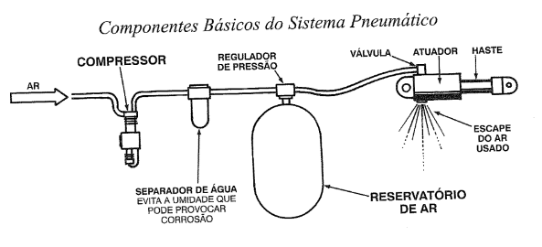 b) Comparado ao sistema hidráulico, o sistema pneumático é mais simples e leve, uma vez que o ar possui baixa densidade e não requer uma linha de retorno, sendo liberado diretamente após o uso.